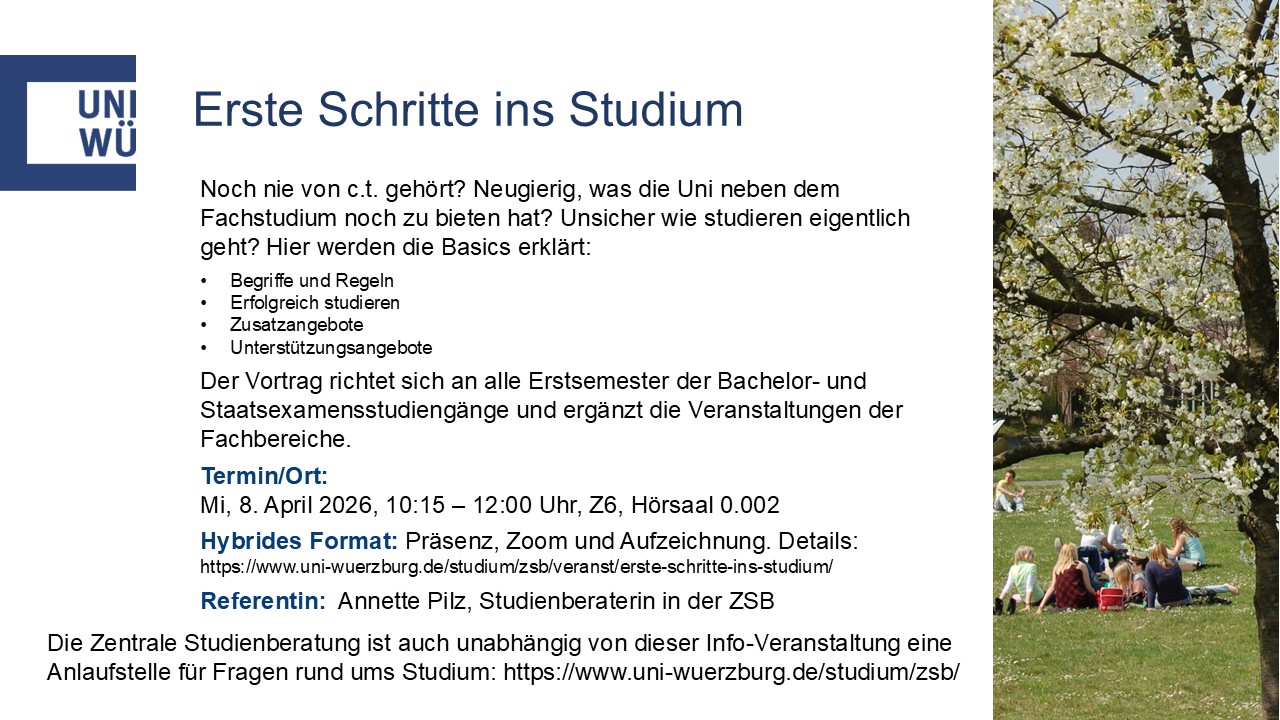 Details: https://www.uni-wuerzburg.de/studium/zsb/veranst/erste-schritte-ins-studium/