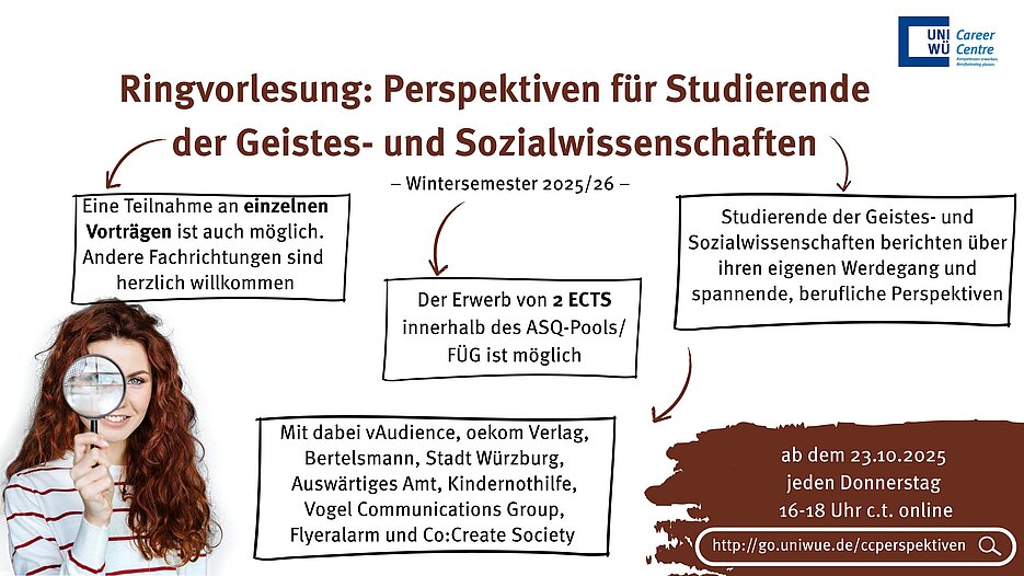 10/09/2025Auch im Wintersemester 2025/2026 bietet das Career Centre die Ringvorlesung "Perspektiven für Studierende der Geist- und Sozialwissenschaften" an. Diese verfolgt das Ziel, Studierenden der geisteswissenschaftlichen und sozialwissenschaftlichen Disziplinen einen Überblick über verschiedene Berufsperspektiven nach dem Studium zu geben.